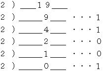 10進数の 19 を2進数に変換するには、 次のようにして 10011 を得ます。