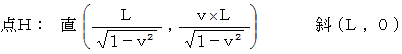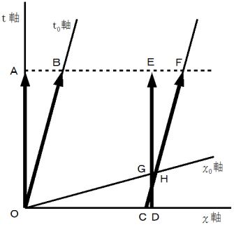 に、 列車の先端がトンネル内にあるかどうかを調べてみましょう。 「 そんなの簡単だ。 観察者Aにとっては、 ローレンツ収縮によって、 列車の先端はトンネル内にあるが、 観察者Bにとっては、 列車の先端はトンネル外にある。」 と言っている人がいますが、 そのとおりです。 そこで、 これをグラフを用いて見てみることにしましょう。
