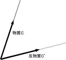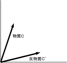 の図 を比較してください。 物質C や 反物質C' の移動を表すベクトルは同じです。