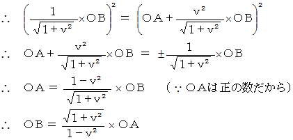 倍 小さいことに注目してください。 この事実だけで、 移動している物質における 「 ローレンツ収縮 」 の説明になっているのですが、 なにかピンボケしています。 なぜなら、 斜交座標系では物質の両端を同時に測定していないからです。 ( 本当は、 斜交座標系では物質は静止していますので、 両端を同時に測定していなくてもきちんと物質の長さを計れているのですが。)そこで、 定説は次のように説明します。