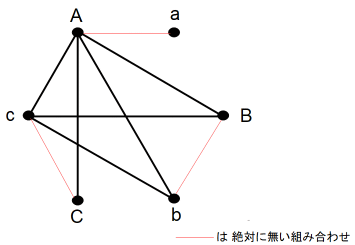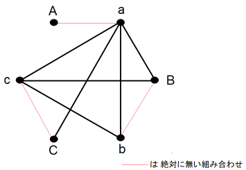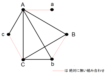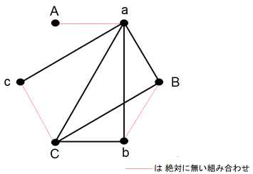 まず、正六角形の頂点になるように6つの ● を描きます。そして時計回りに ● に仮名をつけます。 A → a → B → b → C → c とします。A と a は ある夫婦の夫と妻を表します。次に、A は4人と握手をしたものとして、握手をした相手と線分で結びます。すると、 a は誰とも握手をしなかったことになります。その次に c が3人と握手をしたものとして、握手をした相手と線分で結びます。