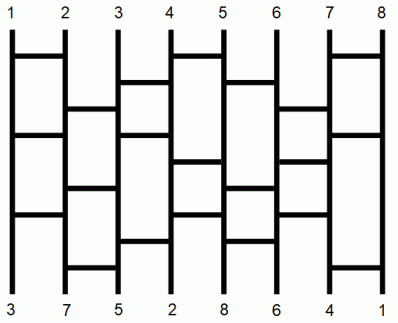 下図は、 8人のあみだくじです。それぞれの縦線の間に3本の横線が引かれています。