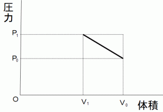 シリンジの注射針側を塞いで気体を入れピストンで抑え込んで密閉状態にします。 最初は P0 パスカルの圧力がピストンから気体にかかるようにピストンに力を加えます。 このとき気体の体積は V0 m3 でした。 それから、 次第に力を大きくして気体を体積が V1 m3 になるまで圧縮していきます。 その経過中の気体の体積と圧力の関係は下図のようになりました。