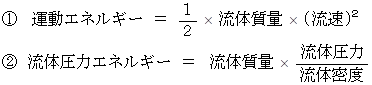 以上の現象や原理は、 ベルヌーイの定理によります。 それは、 流体の位置エネルギーが一定のとき、 次の2つのエネルギーを加えたものは保存されるというものです。