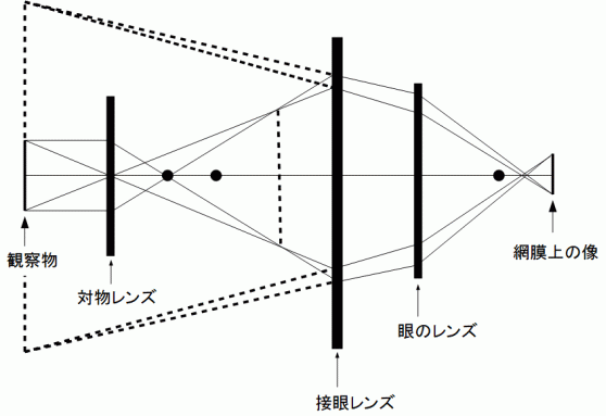 顕微鏡は2つの凸レンズを用いています。 対物レンズの焦点よりも少しだけ離れた所に置かれた試料からの光を対物レンズの屈曲を利用して実像を作ります。 それを、 対物レンズよりも倍率が低くサイズの大きな接眼レンズで見ることによって、 拡大された虚像を見るというものです。 顕微鏡では上下左右が逆さに見えます。 顕微鏡の倍率は、 対物レンズの倍率に接眼レンズの倍率をかけたものになります。