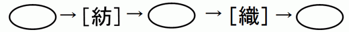 [紡]や[織]は 関数です。 加工前後の物は何でしょうか? 楕円の中に入る漢字を考えてください。