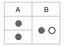 上下2つの引き出しの付いた箱が2つあり、 外見では区別ができません。 A の箱には上下の引き出しに赤玉が1個ずつ入っており、 B の箱には、 一方の引き出しに赤玉が1個、 他方の引き出しに白玉が1個入っています。 ( 上の引き出しに赤玉が入っている確率は 1/2 です。) この2つの箱の中から1つを無作為に選んで上の引き出しを開けたところ、赤玉が入っていました。 この箱の下の引き出しに赤玉が入っている確率はいくらでしょうか?