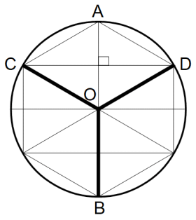 分度器を用いないでケーキを3人で均等に分けるには、次のような方法があります。まず、ケーキの表面に直径ABを引きます。次に直径の一端から直径の 1/4 の長さ内側にその直径に垂直な直線(CD)を引きます。ケーキの中心をOとすると、OB と OC と OD でカットすると、合同なケーキが3ピースできます。
