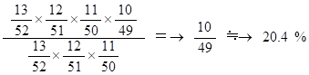 =→ ( 13・12・11・10 ) / ( 52・51・50・49 ) ÷{ ( 13・12・11・10 ) / ( 52・51・50・49 ) + ( 13・12・11・39・4 ) / ( 52・51・50・49・4 ) }