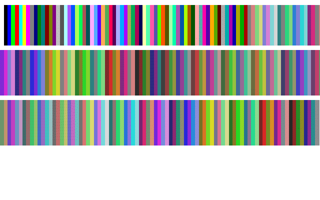 (仮)十進Basicは、 標準装備関数を用いると、 256種類の色を表すことができます。 たとえば、 次のようなプログラムで256色を一挙にスクリーンに表すことができます。 ただし、 残念ながら256種類の色相ではありません。( HTML & JavaScript のプログラムは 16^6 種類の色相を表すことができます。)