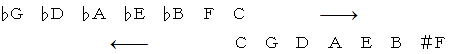 時計回りのときはシャープの付いている方の音名を選び、 反時計回りのときはフラットの付いている方の音名を選ぶことにして、 次のように並べます。 これは、 円になっている五度圏を時計の6時の位置で切って開いて直線化したものです。