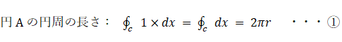 円A と 円B の円周上の無数の点にはすべて1という数が割り当てられています。それを円周に沿って積分すると円周の長さになります。