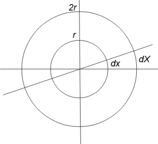 半径 2r の円Bの円周上の無数の点は、大きさが0で、隣同士の距離は0よりもわずかに大きいです。その距離を dX とします。