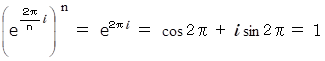 θ の n 倍 が 2π の倍数になるとき、 e θ の n 乗 は 1 になります。