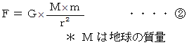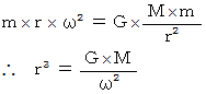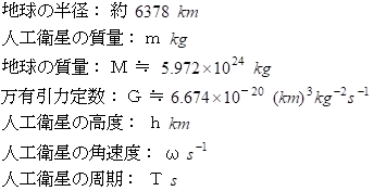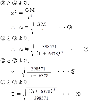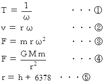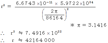 一方、 静止衛星に働いている向心力は、 万有引力の法則から、 次のように表されます。