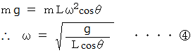 円錐振り子では、 重りは等速円運動をしますが、 重りの回転速度 ( 角速度 ) が大きくなるとそれに伴って軌道半径が大きくなります。 重りの質量を