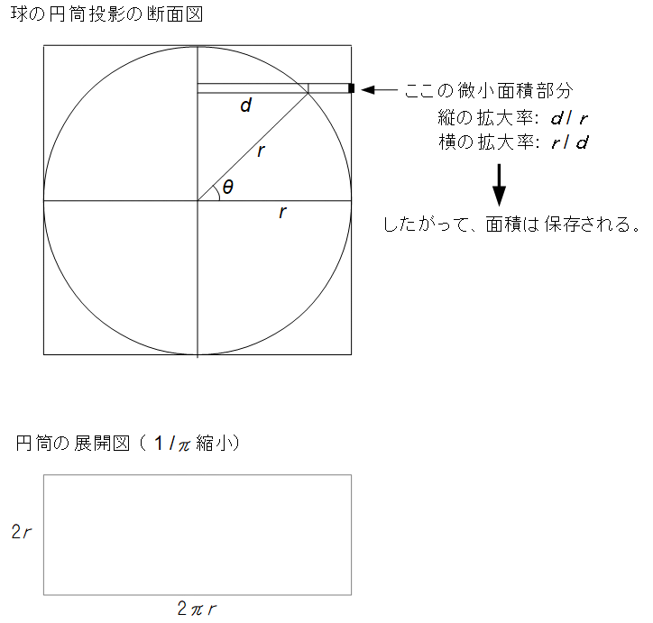 球の円筒投影図は球の表面積を保つ