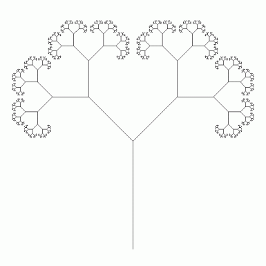 このプログラムを、 2分岐型再帰呼び出しを使って、 フルクタル図形を描く模範的なプログラムに変えると、 次のようになります。