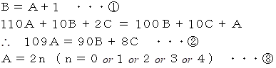 A, B, C は それぞれ異なる 0 〜 9 の整数である。 A, B, C を求めよ。