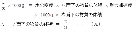 浮力は、水に浸かった物質の体積に等しい水による重力量に等しいので、 次のようになります。