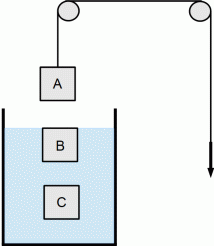 浮力がかかる分、Aの位置よりも小さな力ですみます。 浮力は水深に無関係ですので、 Bの位置 と Cの位置とで ロープを引く力は同じです。