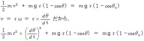 のときの重りの速さを求めてみよう。 それには、 次の力学的エネルギー保存の法則を表す式を用いる。 重りの最下点の高さを