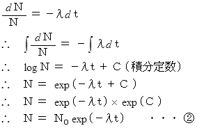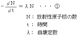 放射性原子核が崩壊する速さは、 放射性原子核の数に比例しますので、 次の式が成り立ちます。