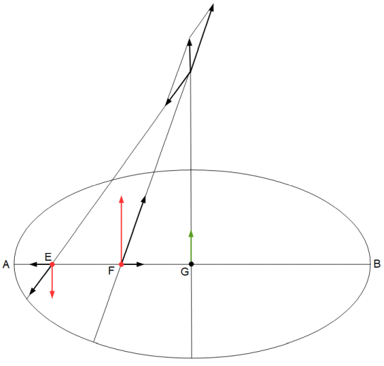 中心を固定すると、2つの力はトルクになります。緑の矢印で表される力はトルクが0であることより、点Eに作用するトルク と 点Fに作用するトルク は吊り合っていて、結果的にはこの楕円には全くトルクが作用していないことになります。