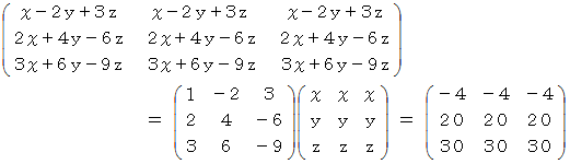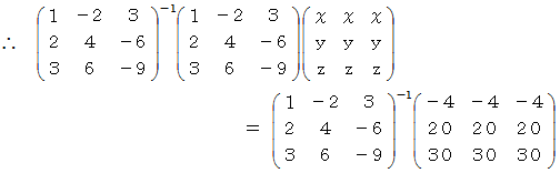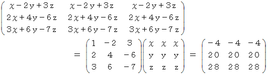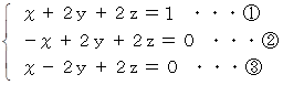 これは困ったことになりました。 そうです。 必ずしも連立3元一次方程式の解は行列を用いて解くことができるとは限らないのです。 では、 次のケースはどうでしょうか?