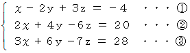今度はうまくいきました。 普通にこの連立3元一次方程式を解くときは、 まず