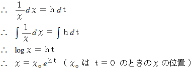 一定の線膨張率で伸びていくゴム紐においては、ゴム紐内の各点の固有端に対する移動速度の大きさはの固有端からの距離に比例します。 では、 もし、 ゴム紐の左端から x メートル離れた所のゴム紐上の点が、 常に速さ hx m/s で直線運動をしているとすると、 時刻 0 秒に左端から x0 メートル離れた所のゴム紐上の点はt秒後にはどの位置にあるでしょうか?