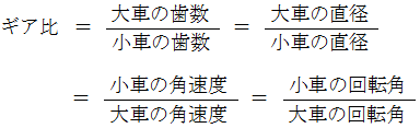 噛み合う2つの歯車の、「 大きい方の歯車の歯数 」の「 小さい方の歯車の歯数 」に対する比率を、 ギア比 といいます。 ギア比は、 大きい方の歯車が1回転したときに小さい方の歯車が何回転するのかを表しています。 とういうことは、 大きい方の歯車を1回転させるためには小さい方の歯車を何回転させればいいのかを表しているということです。