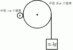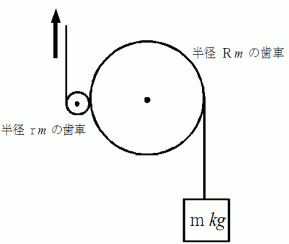 の比較的小さな歯車と噛み合わせます。 物質が静止するためには、 小さな歯車に巻きつけられた紐を真上に向かってどれくらいの力で引っぱなければならいでしょうか?