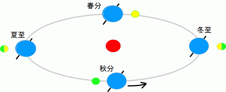 月がおよそ地球の太陽に対する公転軌道上の地球の移動の後方にある時、 地球上で18時を迎える地点では、 月はおよそ南中している半月として見えます。 夏至と冬至の半月の南中高度はほぼ等しく、 それに比べ、 春分の半月の南中高度は高く、 秋分の半月の南中高度は低くなります。