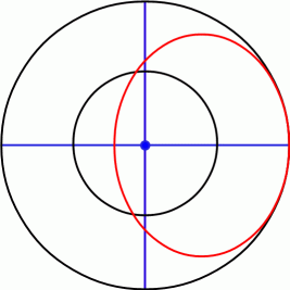 次のような黒色で書かれた二重円構造になっています。 外円は仮の地平線であり、 内円は天の赤道です。 天の赤道は、 地平線上の真西 と 地平線上の真東 と 子午線上の高度55度の点 の3点を通る曲線です。 円の中心には北極星があります。 赤い楕円内が地上から観察することのできる範囲です。 したがって、 赤い曲線は実際の地平線を表しています。