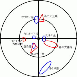 春の星座で目安にするのは 春の大曲線 と 北斗七星 であり、 夏の星座で目安にするのは 夏の大三角 と 白鳥座 と さそり座 であり、 秋の星座で目安にするのは ペガススの大四辺形 と カシオペア座 であり、 冬の星座で目安にするのは 冬の大三角 と オリオン座 である。