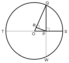 半径 r の円の中心を点Oとし、円周上に点Sをとる。線分OS上に点Pをとり、線分PSの長さを a とする。点Pを通り線分OSに垂直な直線が円周と交わる点の一つを点Qとする。点Pを通り線分QOに垂直な直線が線分QOと交わる点を点Rとする。