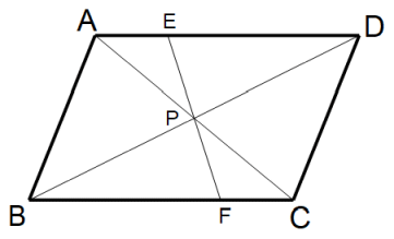 よって、 平行四辺形の対角線の交点を通る直線は平行四辺形の面積を2等分する。