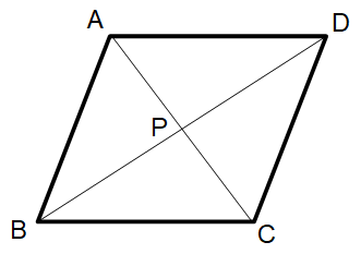 上記の菱形の定義から言えることは、三角形ABD と 三角形CDB は合同な二等辺三角形であということである。二等辺三角形の頂点( 等しい長さの辺の端点が重なった点 )と対辺の中点を結ぶ線分は、元の二等辺三角形を合同なt直角三角形に2等分する線分である。したがって、二等辺三角形の頂点と対辺の中点を結ぶ線分は、二等辺三角形の頂点の対辺と垂直に交わる。したがって、点Pは対角線BDの中点であり、4つの直角三角形 ABP、CBP、CDP、ADP は合同な直角三角形であることが分かる。というわけで、菱形の対角線は垂直に交わることが分かった。