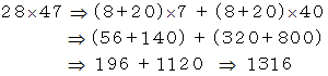 たとえば 28×47 の計算が筆算で行われるとき、 次のようなアルゴリズムになっています。