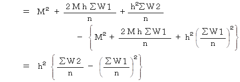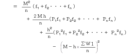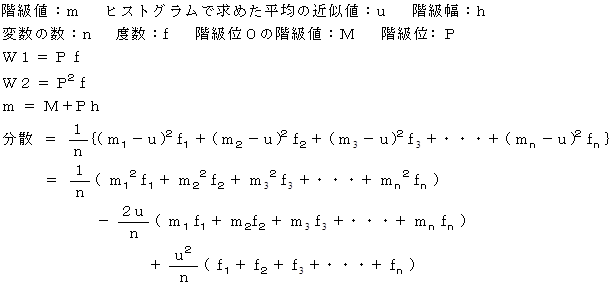 ヒストグラムから求めた平均の標準偏差の近似値 :階級幅 × 正の平方根 {( W2の総計 ÷ 度数の総計 )−( W1の総計 ÷ 度数の総計 ) 2 }