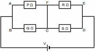 ホィートストン橋式抵抗測定装置は、 次の図のような構造になっています。 ( 左の図 と 右の図 は 同じです。) P と Q は既知の抵抗、 R は測定したい抵抗、 S は可変抵抗です。 FC 間の電圧が 0 になって、 FC 間に電流が流れないようになるような S の値を求めて、 次の式に当てはめると R の値がわかります。