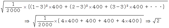 この2000件のデーターの平均は 3 で、 標準偏差は 1 です。 その理由は次の式です。
