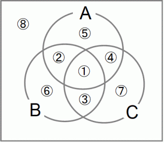 交わっている集合が5つ以上の場合でも、 同様にして、 どれかの集合に属している要素の数を求めることができます。