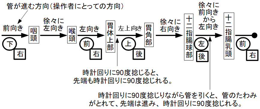 最初に口の中に胃カメラの先端を挿入しますが、そのときモニター画面では舌は上側に、軟口蓋は下側にあって、一般的解剖図に比べて上下反転しています。被検者の左側は画面の左側、被検者の右側は画面の右側です。このとき、胃カメラの先端は検査医にとって前を向いています。