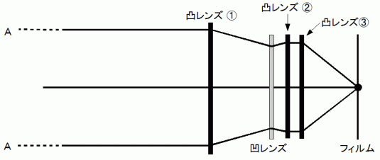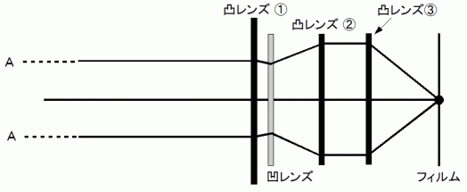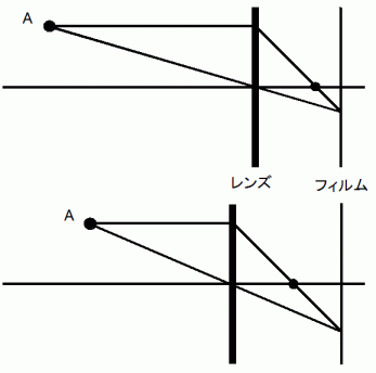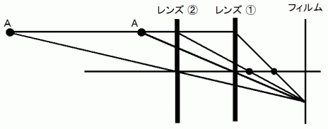 点Aがフィルムから遠ざかっても、 点Aのフィルム上の像の中心点からの距離が変化しないようにするためには、 レンズ