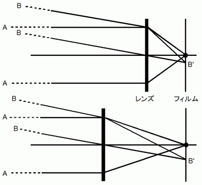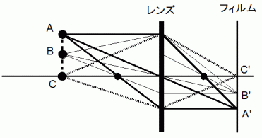 点Aがフィルム上にピントの合った像を結んでいるときには、 点Bや点Cもフィルム上にピントの合った像を結んでいます。