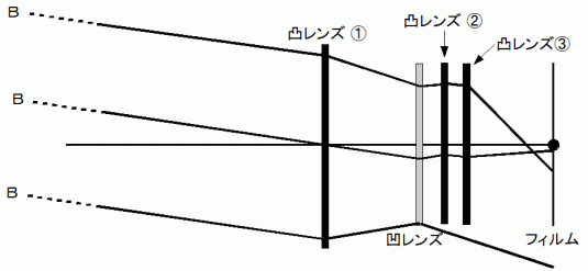 遠景写真の時に、 レンズの焦点距離を変えることによって、 拡大しながらピントを合わせようとするのが、 ズームレンズです。 ズームレンズの基本型は、 凸凹凸凸 の4枚のレンズが組み合わさったものです。 下の図は、 一般的な広角の遠景撮影時の状態です。 凸レンズ