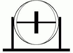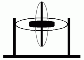 上の図は、 ジャイロスコープの模型です。 内環( 灰色の輪 )にはコマが取り付けられています。内環と外環は2点で固定はされていますが、内環は外環の内部をその2点を結ぶ直線を軸にして自由に回転できるようになっています。 そして外環は2点で外枠に固定されていますが、 外環はその2点を結ぶ直線を軸にして自由に回転できるようになっています。