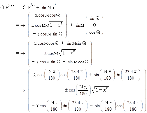 地球を半径 1 の正球とする。 地軸は公転面に対して 23.4 度 傾いているものとする。 公転面を x y 平面とし、 北半球が z 軸の正の方に存在するものとし、 地球の傾いている方向を x 軸の正の方向とし、 地球の中心を原点にとる。 北緯 N 度 の緯線が描く円の曲線上に存在するすべての点を表す位置ベクトルを求めよ。